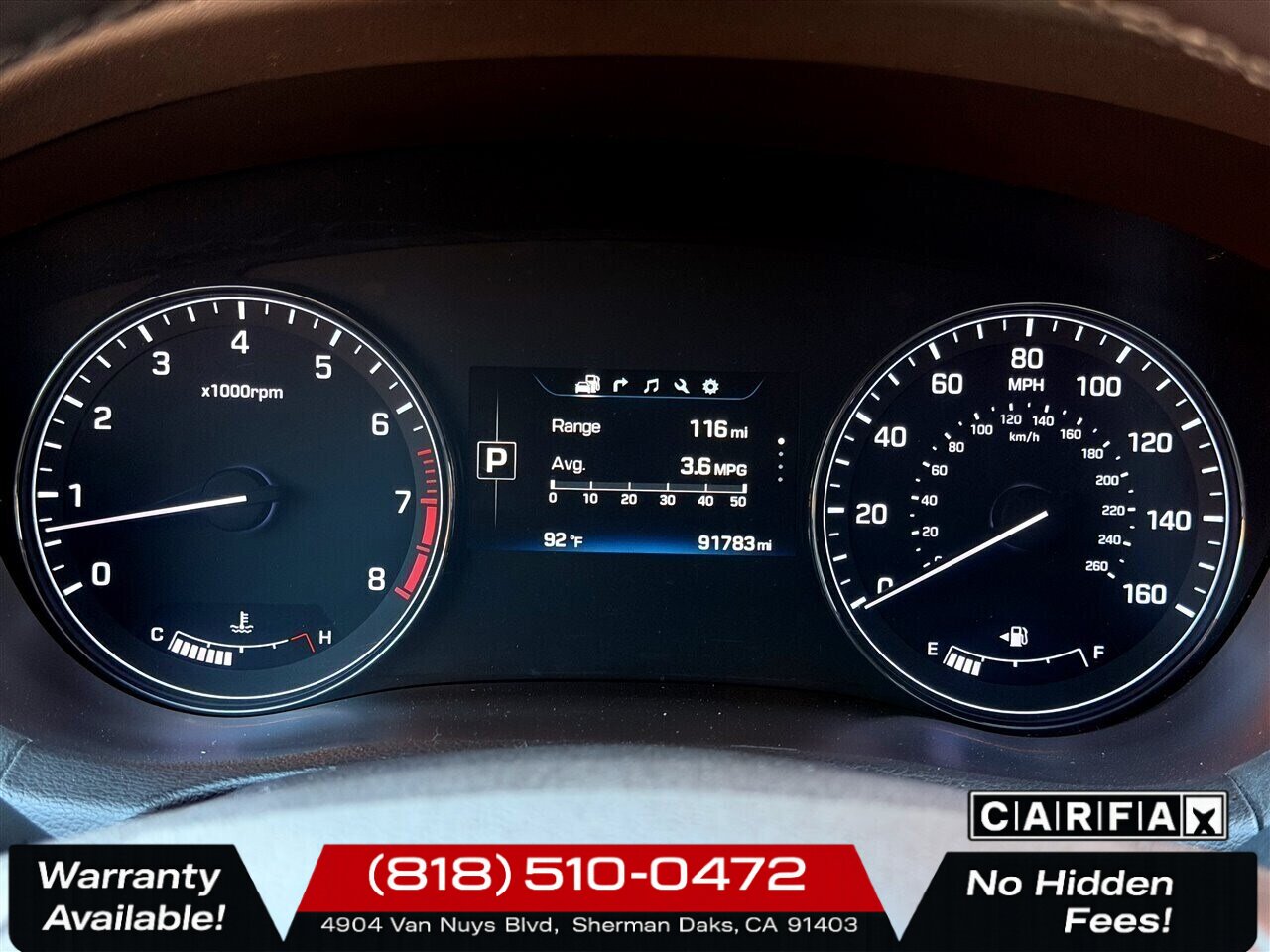 2015 Hyundai Genesis 3.8L — Santiago Silver exterior, Gray interior. This well-maintained example is powered by the 3.8L V6 producing 311 hp and 293 lb-ft of torque, paired with a smooth automatic transmission. It delivers an EPA-estimated 18 MPG city and 29 MPG highway and shows below 92,000 miles on the odometer (averaging under 8,000 miles per year). The vehicle is in excellent overall condition, has a clean CARFAX and a single previous owner.