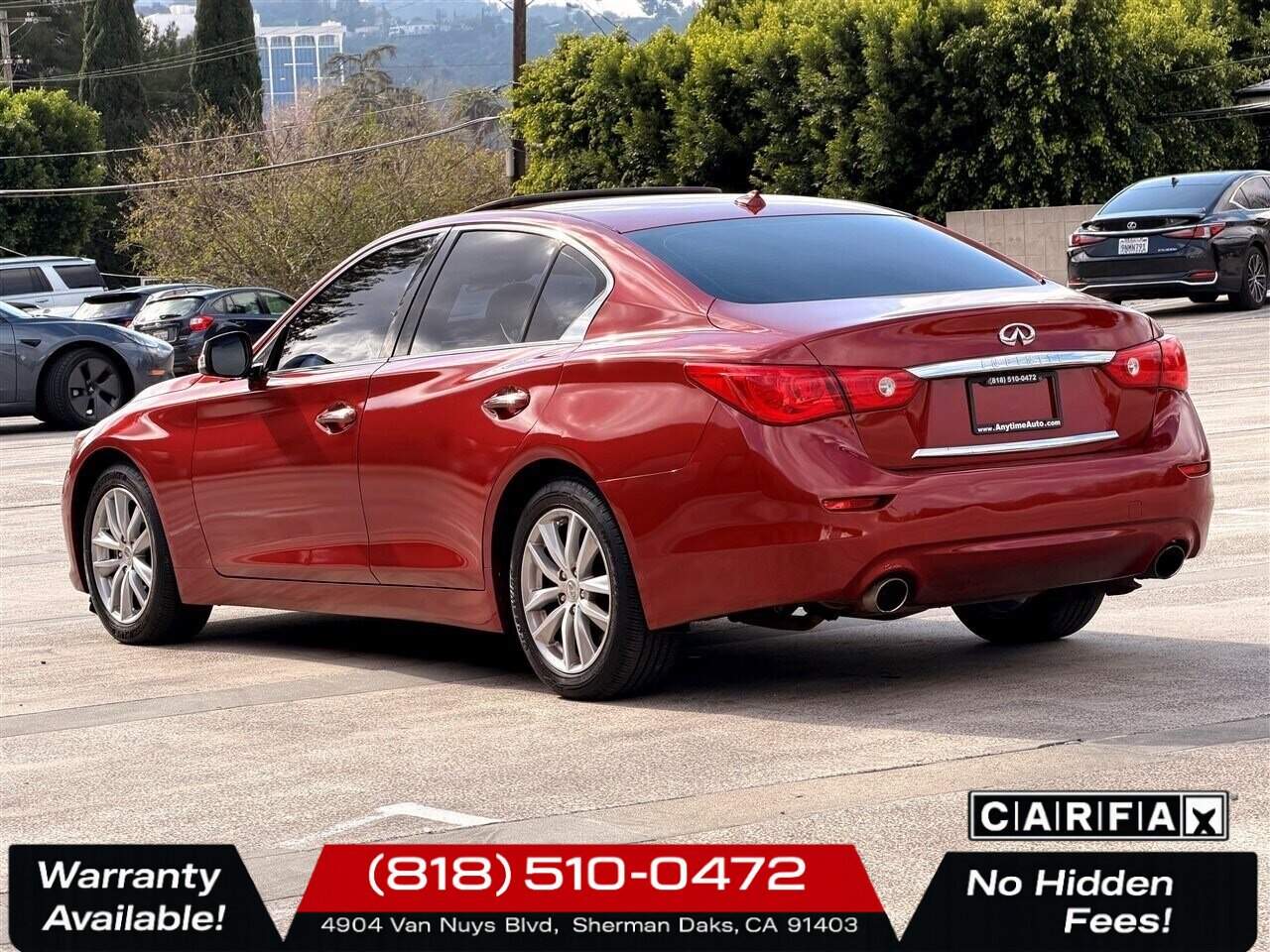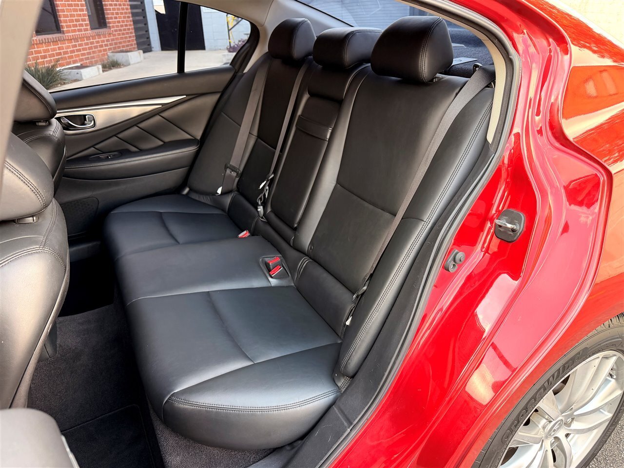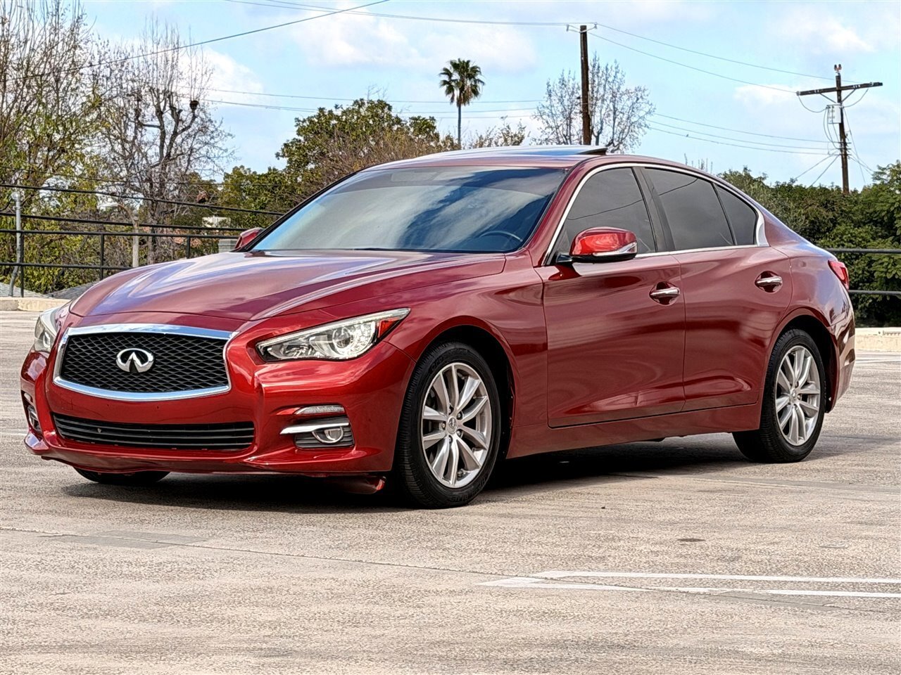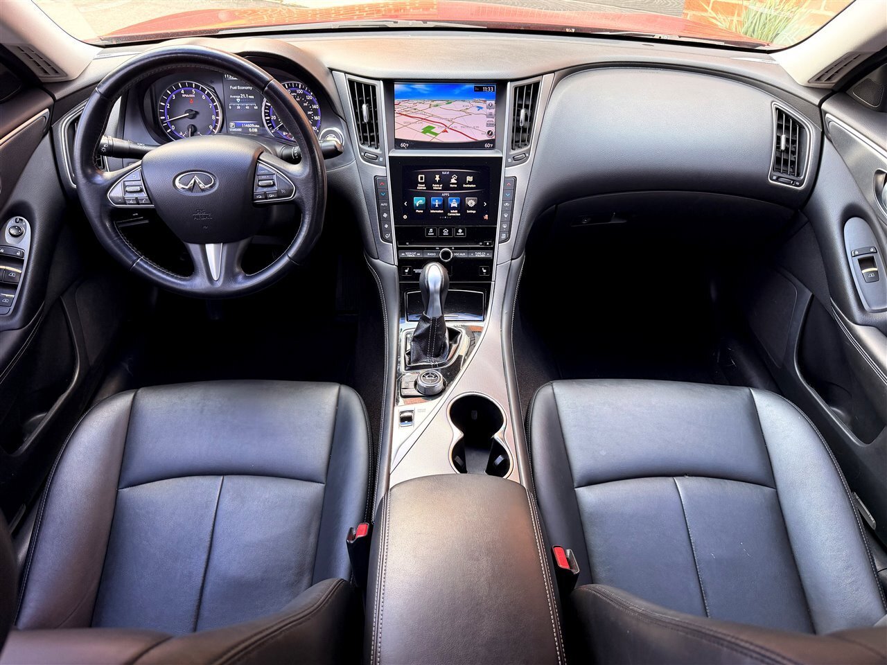 2015 INFINITI Q50 Premium — Venetian Ruby exterior, Graphite interior. This Q50 is powered by the potent 3.7L V6 engine producing 328 hp and 269 lb-ft of torque, mated to a responsive 7-speed automatic transmission with manual shift capability and steering-wheel-mounted paddle shifters for a more engaged driving experience. The car delivers a comfortable balance of performance and efficiency, rated at an EPA-estimated 20 MPG city and 29 MPG highway. With mileage below 115,000 miles (averaging under 10,000 miles per year), this example has been lightly driven and is in excellent overall condition.