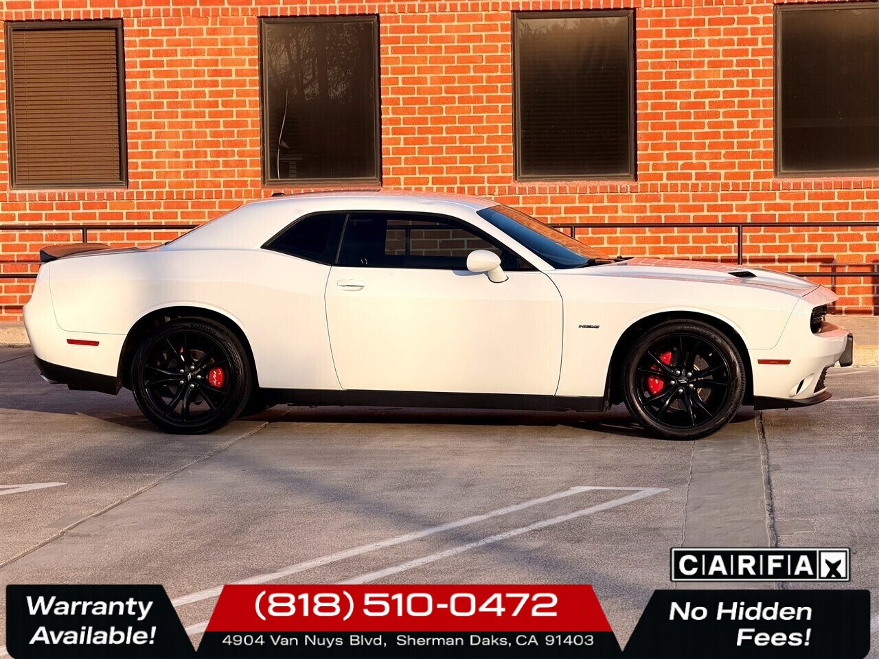 2018 Dodge Challenger R/T — White Knuckle Clear Coat exterior, Black cloth interior. This Challenger pairs classic American muscle styling with modern drivetrain technology, finished in a crisp White Knuckle Clear Coat over a well-preserved Black cloth cabin. The vehicle is in excellent overall condition and comes with a clean CARFAX report.