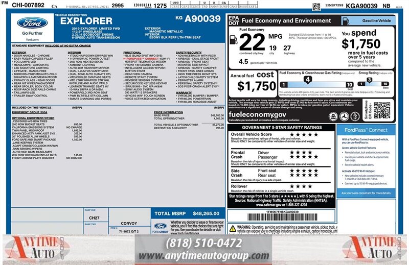 The 2019 Ford Explorer Limited also boasts a number of optional features, including a Dual Panel Moonroof, Inflatable Rear Seatbelts, 2nd Row Heated Bucket Seats, and 20 In. Polished Aluminum Wheels. These features enhance the comfort, convenience, and style of the vehicle.