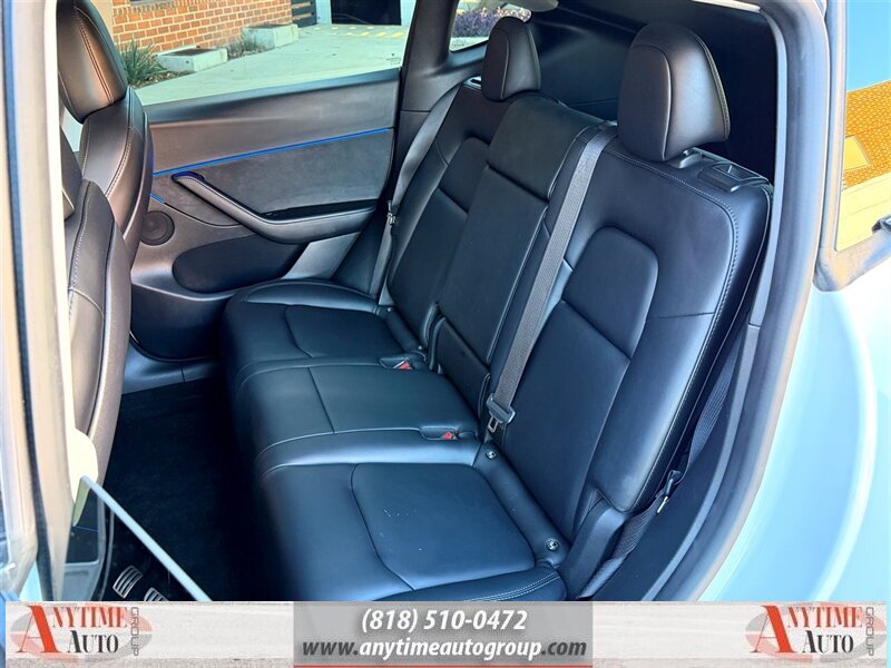 Inside, the cabin is adorned with luxurious Black upholstery, providing a contemporary and elegant atmosphere. The spacious interior is designed to maximize comfort and convenience for both the driver and passengers. The Model Y features a minimalist dashboard layout, highlighted by a large central touchscreen that controls most of the vehicle's functions, from navigation to media controls.